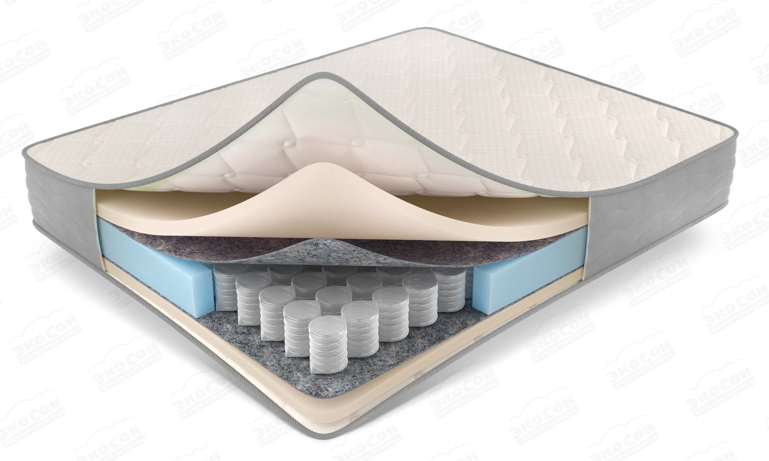 В качестве верхнего наполнителя с обеих сторон используется мягкая эластичная пена EcoFoam. По периметру матраса установлен короб из ППУ, который поддерживает форму матраса на протяжении всего периода его эксплуатации. Чехол из хлопкового жаккарда с высокообъемным бортом из обивочной ткани на ППУ.